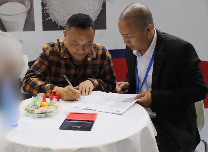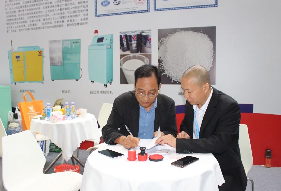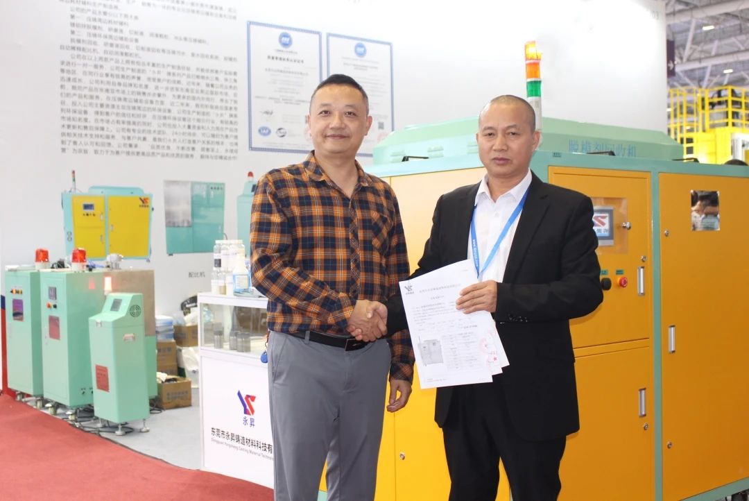 展會現(xiàn)場咨詢客戶 四天的展會,永昇鑄造材料公司收獲頗豐,吸引了許多新老客戶的洽談交流與合作,不僅展示了公司形象和實力,還推介了公司系列產(chǎn)品。同時,還收獲了多筆訂單。展后第三天,永昇鑄造材料公司分別與東莞市鎂利宸五金科技有限公司、重慶凱美科技發(fā)展有限公司、東莞勝輝機(jī)械有限公司等三家企業(yè)簽訂購銷協(xié)議,現(xiàn)場售出2臺脫模劑回收機(jī)、1臺脫模劑配比機(jī)。