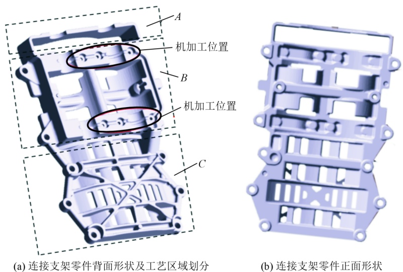 圖1 連接支架零件工藝區(qū)域劃分及3D圖 表1 低壓鑄造支架數(shù)值模擬初始工藝參數(shù)