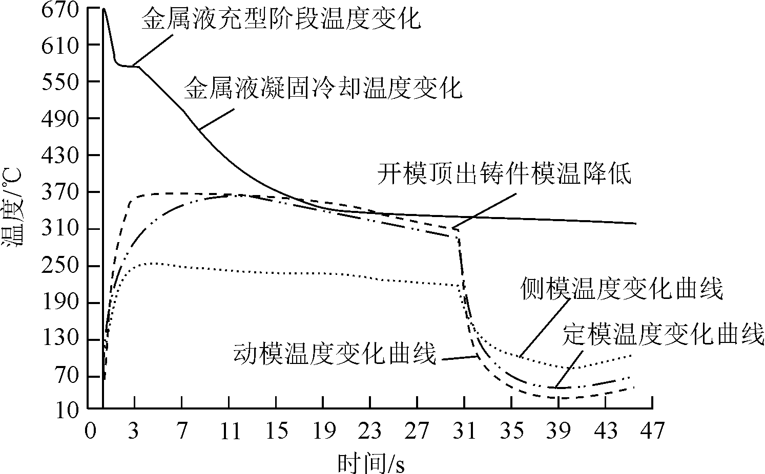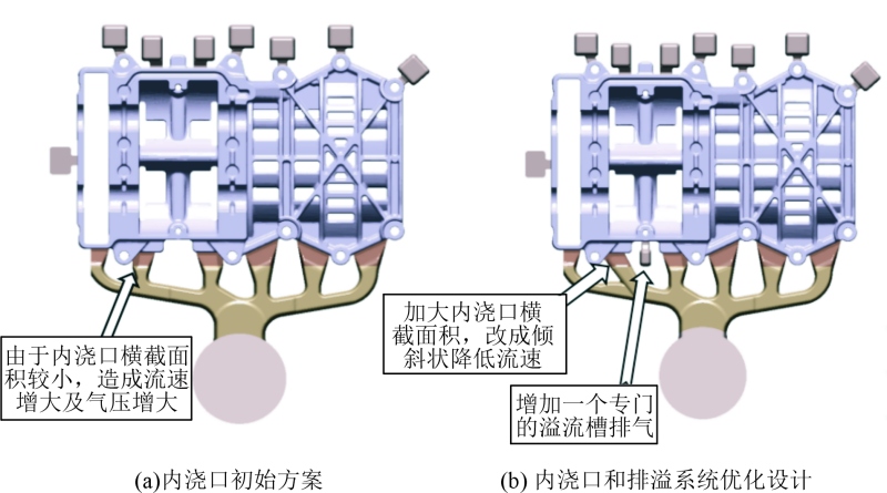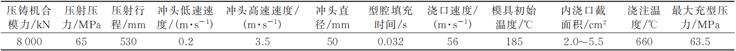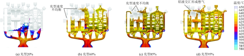 圖8 充型過程金屬液和模具溫度變化模擬圖 結(jié)論 (1)鋁合金連接支架零件區(qū)域差異化的壁厚形狀阻礙了鋁液充型時(shí)的速度和流量均衡,因此初始設(shè)計(jì)6個(gè)相等的內(nèi)澆口容易造成各部位凝固速度差別較大,鋁液交匯處有裹氣和冷隔缺陷。 (2)針對(duì)支架鑄件各區(qū)域的不同的壁厚和結(jié)構(gòu),設(shè)計(jì)差異化的內(nèi)澆口,改變鑄件局部的充型流量與充型壓力關(guān)系,同時(shí)在內(nèi)澆口增加溢流槽,能夠提高排氣效果及改善填充凝固質(zhì)量。 (3)通過充型壓力模擬對(duì)比結(jié)果和P-Q2關(guān)系曲線圖表,證明優(yōu)化方案能改善鑄件包氣和縮松等缺陷。 《鋁合金連接支架壓鑄數(shù)值模擬及工藝優(yōu)化》