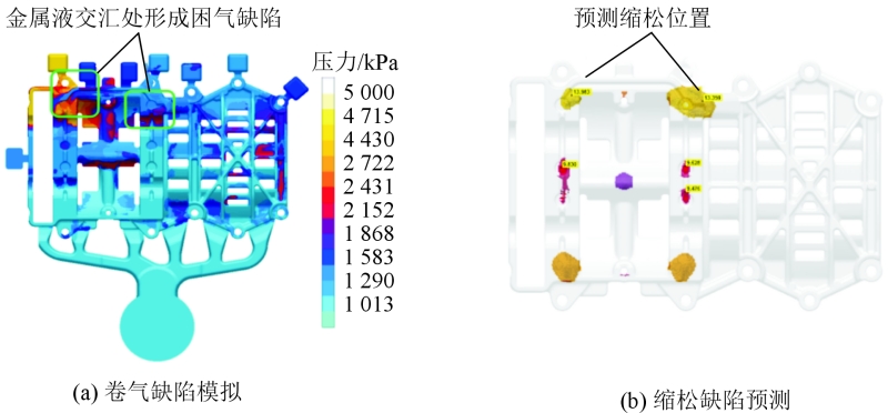 圖2 連接支架壓鑄澆注系統(tǒng)和排溢系統(tǒng)初始設(shè)計(jì) 針對(duì)連接支架零件的結(jié)構(gòu)特點(diǎn)和質(zhì)量要求,采用Magma®軟件對(duì)支架壓鑄充型過程的溫度變化、充型速度、氣壓變化和縮松缺陷預(yù)測(cè)等進(jìn)行模擬。圖3為鋁液充型的各階段模擬。通過模擬對(duì)比可以看出,支架鑄件在凝固過程中各個(gè)工藝區(qū)域的充型速度和冷卻凝固順序存在著不均衡現(xiàn)象。從圖3a可以看出,鋁液初始填充階段,采用多個(gè)垂直式內(nèi)澆口同時(shí)充型,使鋁液與模具間的熱傳導(dǎo)速度呈現(xiàn)不同步,溫度變化速度出現(xiàn)一定差異現(xiàn)象。其次,由于零件各區(qū)域的壁厚和形狀差異造成了填充型腔的金屬液體積及充型速度差別較大,充型完成時(shí)間不同步, C區(qū)域基本充滿時(shí),A、B區(qū)域部分位置還有接近20%的型腔未充滿。從圖3c和圖3d可以看出,由于A、B區(qū)域的充型進(jìn)程慢于其他位置,充型速度不均衡會(huì)造成鋁液交匯形成憋氣。同時(shí)充型過程各部分區(qū)域溫度梯度分布十分不均勻,容易產(chǎn)生縮松、縮孔和冷隔缺陷。因此,為了實(shí)現(xiàn)鋁液充型時(shí)保持流量、速度均衡進(jìn)入型腔,需要針對(duì)性增大相應(yīng)位置的內(nèi)澆口面積,加大充型流量并加快充型速度,尤其對(duì)于零件A、B區(qū)域的重點(diǎn)位置,從而降低冷隔缺陷的可能。 針對(duì)零件框架分散結(jié)構(gòu)和后續(xù)機(jī)加工對(duì)鑄件凝固致密度要求較高的特點(diǎn),還進(jìn)行了充型過程的氣壓變化模擬和內(nèi)部縮孔、縮松缺陷預(yù)測(cè),見圖4。從圖4a可以看出,在圖1a的A、B區(qū)域的相交接處,黑色線框標(biāo)示出氣壓值較高,鋁液流態(tài)顯示出機(jī)加面有裹氣,機(jī)加工后會(huì)有內(nèi)部氣孔出現(xiàn)的可能。同時(shí)內(nèi)澆口位置也有少量鋁液裹氣,其原因應(yīng)該是6個(gè)內(nèi)澆口的進(jìn)料流量和速度不均衡,來自不同內(nèi)澆口的鋁液以不同的速度和溫度在鑄件的最后填充位置進(jìn)行交匯時(shí),容易在金屬液交匯處形成裹氣、層流和流痕等缺陷。其次在靠近內(nèi)澆口局部位置的少量鋁液裹氣還會(huì)產(chǎn)生冷料積聚,機(jī)加工后也會(huì)有發(fā)生澆不足和分層缺陷的趨勢(shì)。