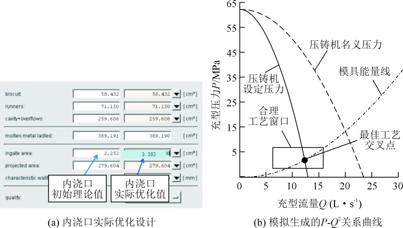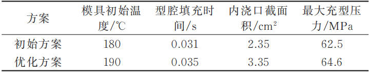 圖6 通過P-Q2關(guān)系曲線檢查內(nèi)澆口設(shè)計(jì)的合理性 表2 初始工藝與優(yōu)化方案參數(shù)對(duì)比表