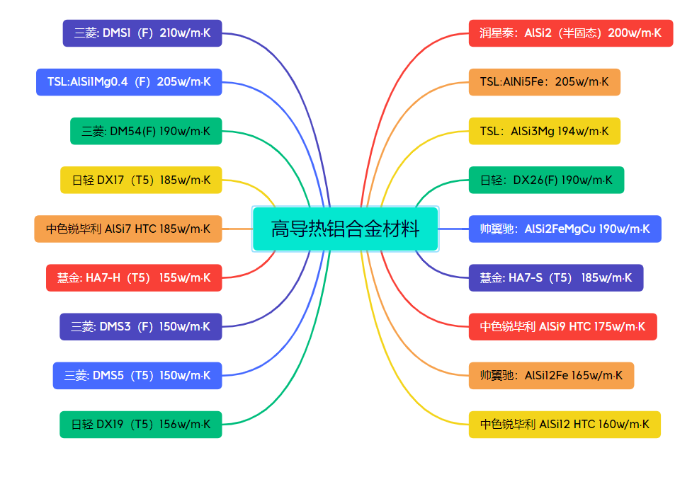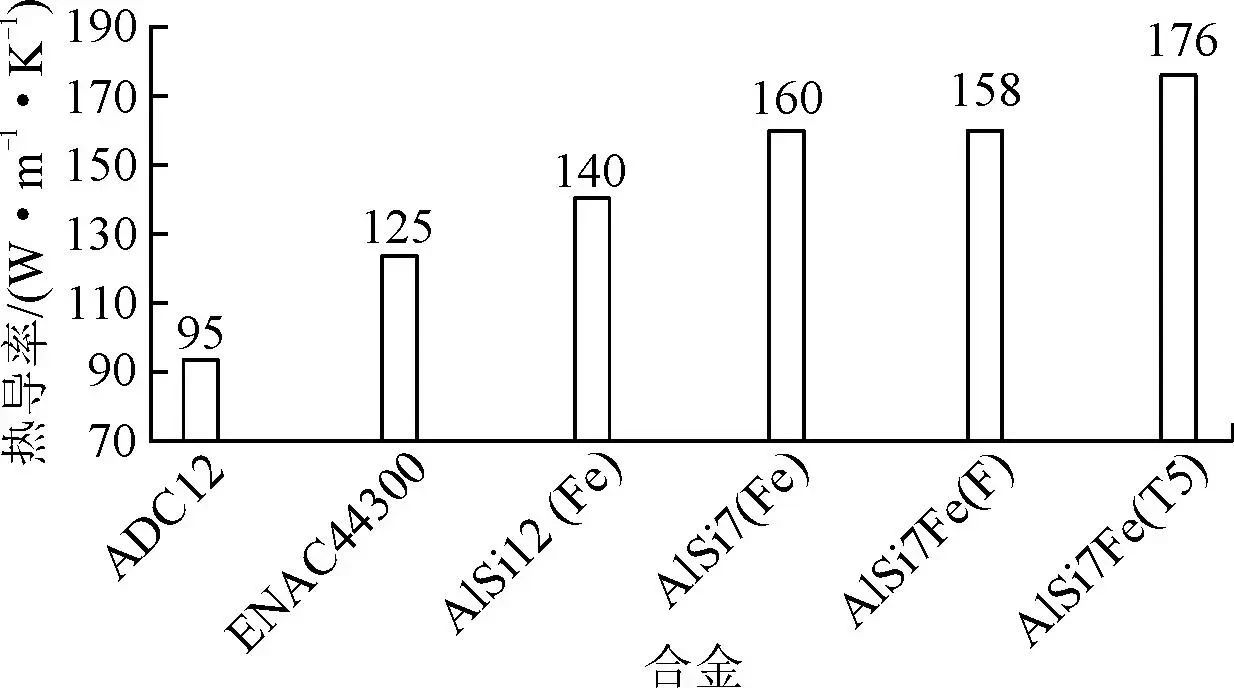 圖3 導熱壓鑄鋁合金代表零件 導熱領域適用鋁合金材料見表4,和ADC12合金相比,為了保證熱導率,要去除雜質合金元素,特別是對熱導率影響比較大的元素,如Ti、Mn、Zr、Mg等,各元素對熱導率的影響見圖4。另外,T5熱處理(200~350℃)可以消除壓鑄過程中產生的內應力,提高材料的熱導率(見圖5)。圖6為高導熱壓鑄鋁合金材料統計??梢钥闯?,合金元素含量越低,熱導率越高,為了獲得200W/(m·K)左右的熱導率,Si的含量通常在2%左右,或者使用Ni元素作為主要合金元素,或者用半固態工藝。