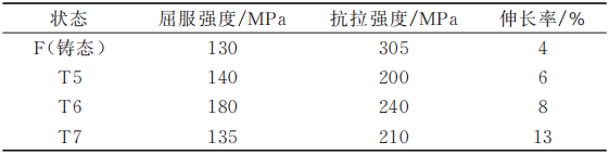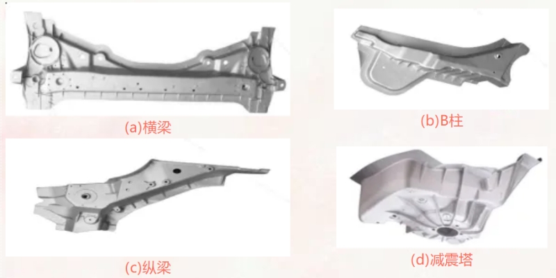 圖6 高導熱壓鑄鋁合金統計 傳動汽車結構件主要有橫梁、B柱、縱梁、減震塔等,見圖7。根據車身鏈接安全和鏈接的要求,這類產品通常需要更高的伸長率,一般要求12%以上;對應的壓鑄鋁合金材料主要為萊茵鋁業形發的Silafont-36(AlSi10MnMg),其不同狀態下性能見表5,在EN1706對應牌號為ENAC 43500,該合金用Mn替代Fe元素,解決壓鑄粘模的問題,同時,Mn元素對合金的伸長率副作用不明顯。經過T7熱處理后,最終伸長率達到12%以上。但是由于T7熱處理的溫度為450~480℃,壓鑄內部的微小氣孔膨脹,產生氣泡,同時,固溶過程高溫到低溫過程造成產品變形,給產品的外觀輪廓及尺寸帶來困擾,造成成本大幅度增加。
