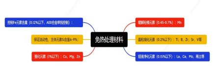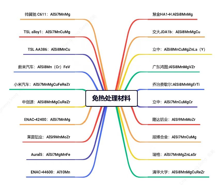 表5 Silafont-36(AlSi10MnMg)不同狀態下的性能 根據國海證券的調研報告,2022年特斯拉Model Y的后底板和前機艙高度集成,零件數量從171個零件縮減為2個(圖8),焊接點位可以減少1600多個。由于這類產品的尺寸比較大,在熱處理過程中容易變形,尺寸得不到很好保證。因此,一體式大型壓鑄件無法通過熱處理調節性能,Silafont-36(AlSi10MnMg)無法在這類產品中應用。為了解決這個問題,新型免熱處理材料的研發已迫在眉睫;材料成為發展一體式壓鑄的基礎。目前,整車廠蔚來、小米等都在布局材料方面的專利,零部件壓鑄企業,如文燦、鴻圖等,原材料提供商,如帥翼馳、申源創、中鋁國際、日輕金屬、蘇州慧金等有相應的專利儲備,高校,如清華大學,上海交通大學等都在積極參與(見圖9)。