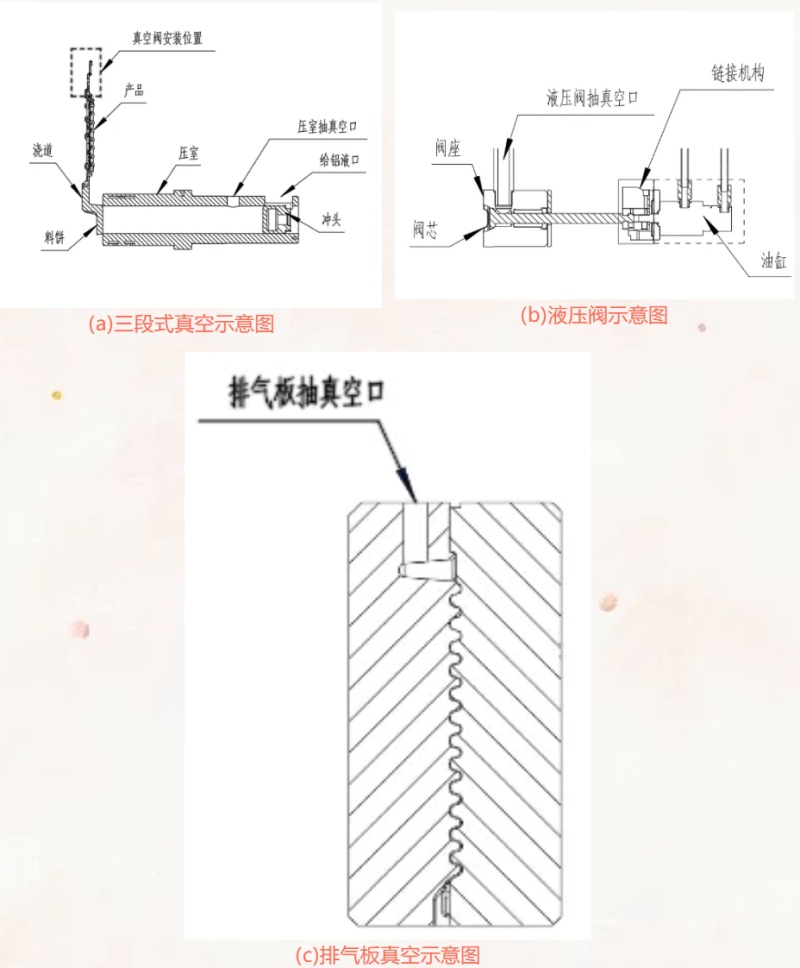 圖10 免熱處理材料合金元素分析 免熱處理合金中Si含量在6%~9%之間,從相圖中可以看出,Si含量越低,液相線的溫度越高,造成鋁液的流動性下降。其次,由于Si含量降低,液相線溫度和固相線溫度的溫度差拉大,壓鑄產品在凝固過程中產生縮孔的概率也大幅度提升,工藝難度大大提高;此外,Si含量降低,凝固收縮率變大,造成脫模阻力加大,給脫模及尺寸控制帶來困難。為了解決這些問題,采用三段式抽真空技術,見圖11,既保證了產品遠端的成形,同時又保證了伸長率。三段式抽真空的原理為,當沖頭剛過鋁液口時,壓室真空通道、液壓閥真空通道、排氣板真空通道全部打開,開始抽真空。此時,沖頭移動速度處于低速階段,一般速度控制在0.15~0.3 m/s之間;當沖頭到壓室抽真空點后,壓室抽真空通道關閉;沖頭繼續向前移動,當啟動高速速度位置前100mm位置,見圖12。為了避免液壓真空閥堵塞,關閉液壓閥,進入高速充填階段。當壓射結束時,排氣板真空通道關閉。三段式真空過程,壓室真空和液壓閥真空的通道的優點在于截面積大,可以在短時間內將模具內的真空度降低。但是壓射開始時,模具間隙位置(如推桿間隙),會有空氣進入,此時,排氣板真空通道一直打開,有效平衡了模具漏氣,讓整個壓射過程都處于比較高的真空度下,通常真空度在5kPa以內。