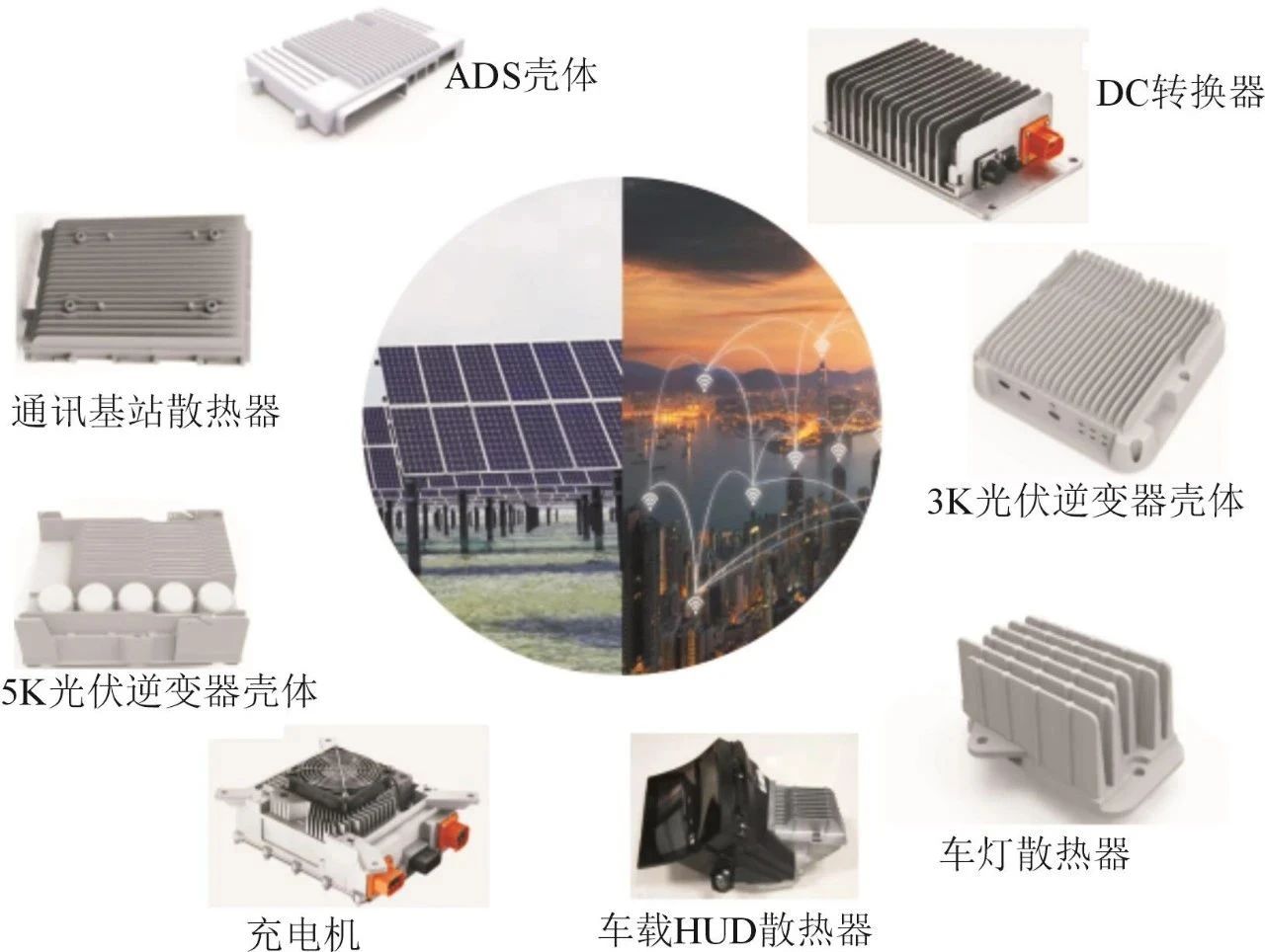 表3 中國壓鑄鋁合金化學成分(%) 可以看出,各種標準的鋁合金材料成分具有相似性,可以根據使用要求選擇合金材料。常規的壓鑄鋁合金,對伸長率、熱導率沒有特殊的要求,主要用于汽車、摩托車發動機零部件,如發動機覆蓋件、油底殼、缸體、變速器殼體等。 隨著5G技術的發展,通訊基站用壓鑄鋁合金越來越多(見圖1),主要用于生產散熱器殼體。由于傳統的ADC12鋁合金的熱導率只有100W/(m·K),壓鑄材料一般選擇ENAC44300,以提高零件的熱導率;此外,可采用200~350℃的T5熱處理。除了5G通信領域之外,光伏行業也對壓鑄鋁合金的需求越來越大,代表零部件為逆變器殼體,見圖2。“光伏+儲能”已成為多國光伏開發的標準配置。在搭配儲能以后,將為光伏帶來長期、可持續的發展動力。預計2025年全球光伏新增裝機370GW,屆時儲能逆變器的新增需求約為74GW。專家預測,到2025年,世界能量供給來源中的2%來自于光伏發電,到2055年,光伏發電將會輸送更多的能量,約占總能源供給的25%,到2150年將超過50%。這類鋁合金除了對導熱有需求之外,為了應對意外爆炸不產生碎片,對伸長率也有一定的要求,通常要求在5%以上。散熱領域主要的零部件見圖3。主要包含ADS殼體、DC轉換器、基站散熱器、光伏逆變器、充電機、車載散熱器和車燈散熱器等。