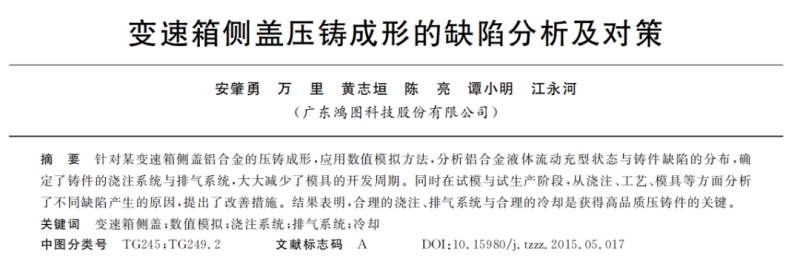 廣東鴻圖科技股份有限公司工程師安肇勇等在《特種鑄造及有色合金》期刊上發表了題為“變速箱側蓋壓鑄成形的缺陷分析及對策”的文章,作者針對某變速箱側蓋鋁合金的壓鑄成形,應用數值模擬方法,分析鋁合金液體流動充型狀態與鑄件缺陷的分布,確定了鑄件的澆注系統與排氣系統,大大減少了模具的開發周期。同時在試模與試生產階段,從澆注、工藝、模具等方面分析了不同缺陷產生的原因,提出了改善措施。結果表明,合理的澆注、排氣系統與合理的冷卻是獲得高品質壓鑄件的關鍵。 圖文結果 本課題開發的汽車變速箱側蓋壓鑄件見圖1。該鑄件輪廓尺寸為425 mm×355 mm×71 mm,質量為3.3kg,平均壁厚為2.3mm,投影面積為112280mm2鑄件材質為Al-11Si-2Cu,有多處厚壁熱節部位,易產生縮孔缺陷;產品毛坯平面度要求為0.6 mm,外觀無明顯的壓痕;產品加工后密封面氣縮孔為Φ0.5~1.0mm的允許1個,小于Φ0.5mm的允許2個,軸承孔機加工后不允許有氣縮孔外露;內腔試漏壓力為0.05MPa,泄漏量≤8mL/min,油道試漏壓力為0.3 MPa,泄漏量≤8mL/min;硬度(HB)≥58。該鑄件在13500kN的壓鑄機上生產。