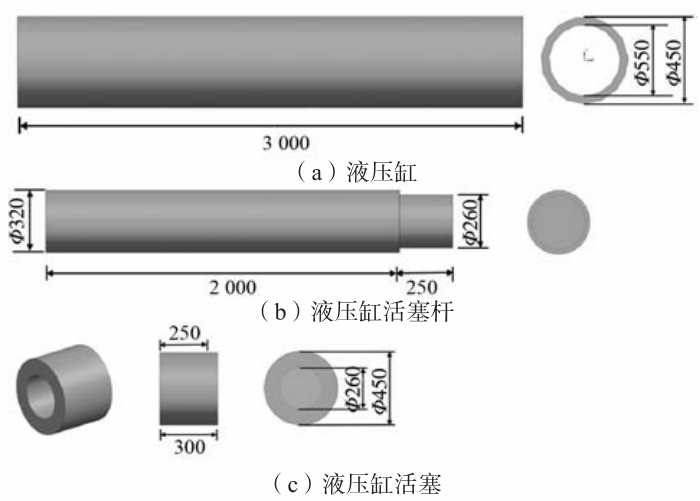 圖2 壓射系統裝配數值模型 壓射室部分具體尺寸如圖3所示,液壓缸部分具體尺寸如圖4所示,增壓缸部分具體尺寸如圖5所示。