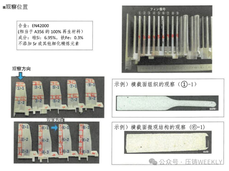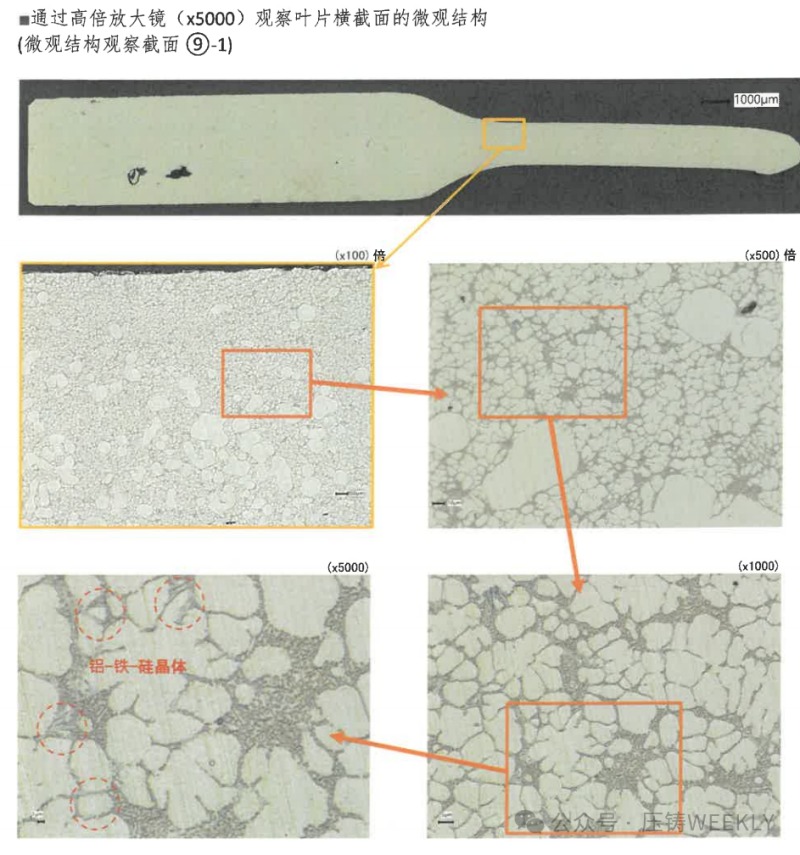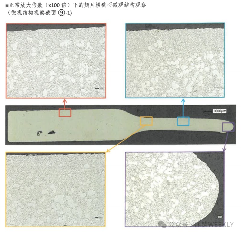 ![]() 原標題:技術(shù)驗證:宇部對康普泰克流變壓鑄法的微觀結(jié)構(gòu)表現(xiàn)分析 宇部興產(chǎn)機械株式會社(UBE Machinery)近期對康普泰克(Comptech)Rheocast 流變壓鑄法生產(chǎn)的散熱器翅片進行了系統(tǒng)的微觀結(jié)構(gòu)分析,其結(jié)果為高性能薄壁鑄件制造提供了重要技術(shù)參考。 本次分析對象為高度 105mm、頂部寬度 0.8-1.0mm、斜度 0.5-1° 的散熱器翅片,采用 EN42000 合金材質(zhì) —— 該材質(zhì)為 A356 的 100% 再生材料,含硅 6.95%、鐵 0.3%,且未添加 Sr 等細化精煉元素。通過微觀觀測發(fā)現(xiàn),翅片從 3mm 厚底部至 1mm 厚頂端的全域組織呈現(xiàn)高度均質(zhì)性:基體由粒徑約 50μm 的初生鋁球狀顆粒構(gòu)成,顆粒間隙分布極細 α 相鋁,二者間隙中則形成共晶硅結(jié)構(gòu)(灰色區(qū)域),整體僅含少量卷氣與縮孔,金屬包裹完整性優(yōu)異。