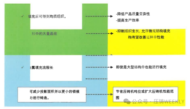 對比傳統(tǒng)工藝,該技術(shù)展現(xiàn)出顯著優(yōu)勢。傳統(tǒng)半熔融 / 半固態(tài)成形工藝中,薄壁翅片區(qū)易出現(xiàn)共晶 Si 相偏析問題,而康普泰克流變壓鑄法通過在澆注湯勺內(nèi)生成大量晶核,有效抑制了共晶 Si 偏析。這一特性使得未熱處理的壓鑄材料抗拉性能(尤其延伸率)大幅提升,為改善大型車身、底盤壓鑄件的沖擊吸收能力提供了可行路徑。
