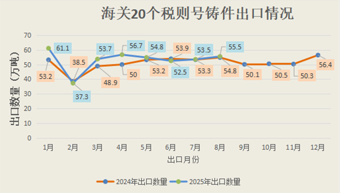 根據海關數據統計,2025年1-8月我國鑄件出口數量同比增長,20個稅則號出口總量423.5萬噸,同比增長4.3%。