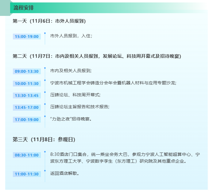 1、部分報告人: 持續(xù)更新…… 三、寧波市機械工程學會鑄造分會年會暨機器人材料與應用專題沙龍【嘉賓單位:大連理工寧波研究院、寧波人工智能產業(yè)研究院、寧波數字孿生(東方理工)研究院、浙江萬里學院等】。 四、經貿洽談與商務酒會。 五、參觀考察活動:寧波人工智能超算中心、寧波東方理工大學、寧波數字孿生(東方理工)研究院及其他重點企業(yè)。 六、科技周系列活動等。 舉辦時間:2025年11月6-8日