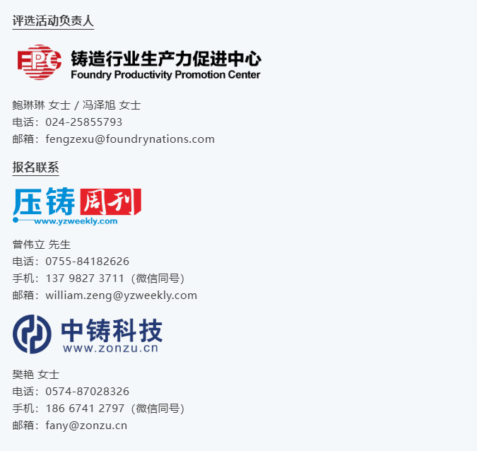 ![]() Award of Die Casting Innovative Technologies 創新技術評選活動 歷經20余年的高速發展,中國壓鑄行業目前已經進?到轉型升級的關鍵時期,協同創新與高質量發展逐漸成為行業共識。為鼓勵及帶動壓鑄行業相關企業技術與產品創新,在全行業形成創新風尚,提升企業競爭力,鑄造行業生產力促進中心自2017年起在全行業組織開展“壓鑄行業年度創新技術與產品評選”活動。截止目前,共認定及表彰國內外壓鑄領域創新技術與產品100余項,極大的促進了我國壓鑄行業的發展與技術進步。 ♦ 提示:活動全程不收取任何費用! 2026 現將2026年度全國壓鑄行業創新技術與產品評選活動相關事宜通知如下,歡迎相關企業及單位積極參與。 參與企業范圍 壓鑄及有色鑄造全產業鏈及上下游相關企業。 參評范圍 評選對象包括壓鑄及有色鑄造行業的創新產品、創新技術、創新材料、創新工藝、創新應用等。