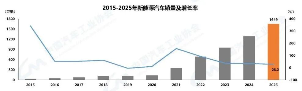 新能源汽車依舊是行業增長的核心動力,我國新能源汽車產銷量已連續11年位居全球第一。2025年,在政策利好加持、產品供給豐富、基礎設施持續完善等多重積極因素共同作用下,新能源汽車市場持續擴容,產銷量成功突破1600萬輛,分別完成1662.6萬輛和1649萬輛,同比分別增長29%和28.2%。值得關注的是,2025年新能源汽車新車銷量占汽車新車總銷量的比例達47.9%,較去年同期提升7個百分點,產業電動化轉型進程持續加速。
