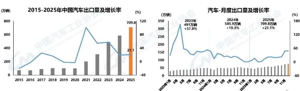 海外市場開拓成效顯著,成為拉動行業增長的另一重要引擎。2025年,國內汽車企業愈發重視海外市場布局,中國品牌國際競爭力持續提升,合資企業出口同樣表現亮眼,疊加新能源汽車出口的快速增長,推動我國汽車出口再上新臺階。全年汽車出口量達709.8萬輛,首次突破700萬輛大關,同比增長21.1%。其中,新能源汽車出口表現尤為突出,全年出口261.5萬輛,同比激增1倍,成為出口增長的核心驅動力。