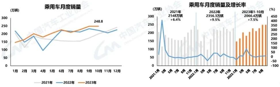 ![]() 近日(11月10日),中國汽車工業協會(簡稱:中汽協)發布10月汽車產銷數據及經濟運行情況。據中汽協統計分析,2023年10月,進入金秋十月,多地車展與促銷活動火熱進行,各大車企新車型持續發布,進店客流顯著增加,進一步拉動汽車消費。 2023年10月,我國汽車產銷分別完成289.1萬輛和285.3萬輛,同比分別增長11.2%和13.8%。汽車產銷繼9月后再創當月歷史同期新高。其中,乘用車產銷分別完成251.3萬輛和248.8萬輛,同比分別增長7.6%和11.4%;商用車產銷分別完成37.8萬輛和36.5萬輛,同比分別增長42.7%和33.4%;新能源汽車產銷分別完成98.9萬輛和95.6萬輛,同比分別增長29.2%和33.5%,市場占有率達到33.5%。